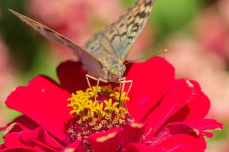 Beautiful Silver-washed fritillary(Argynnis anargyra) butterfly on a pink zinnia flower in a flower bed in the garden on a sunny autumn day, close-up.