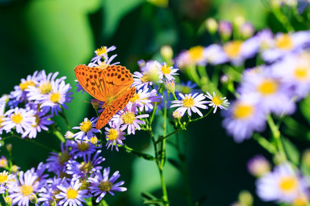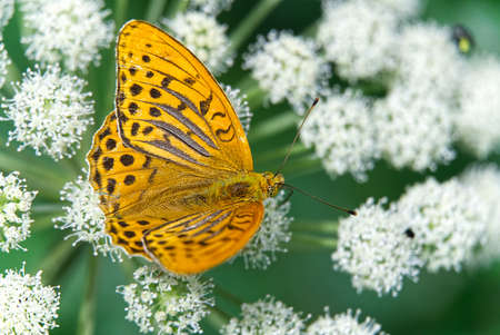 The dark green fritillary butterfly collects nectar on flower. Speyeria aglaja, previously known as Argynnis aglaja is a species of butterfly in the family Nymphalidae.