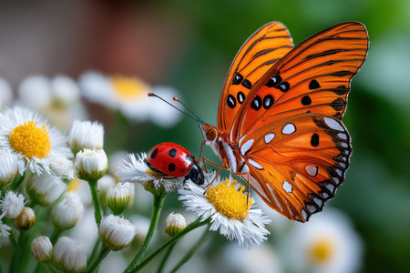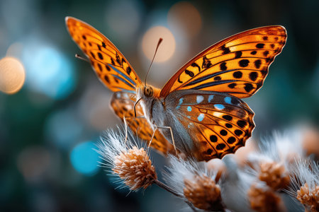 butterfly sucking nectar from flower closeup sunny summer day at mountain