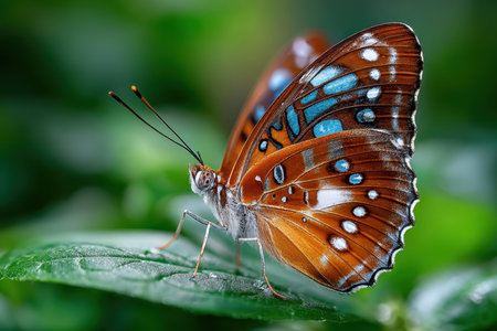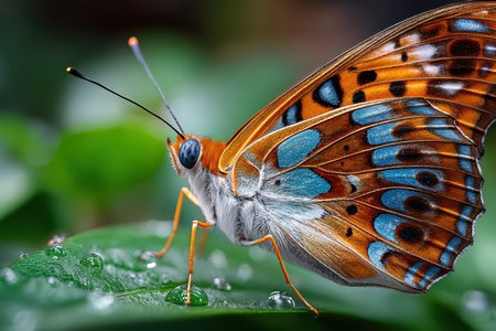 A colorful butterfly with intricate wing patterns rests on a dewy green leaf