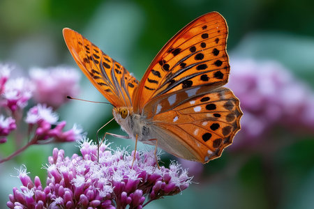 A butterfly with orange and white wings rests on a cluster of pink flowers
