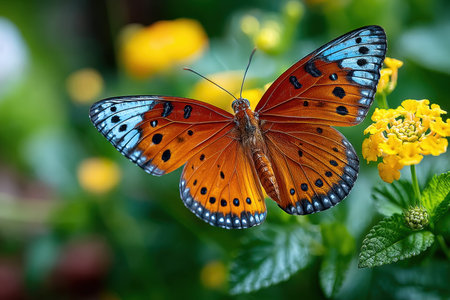 A striking butterfly with blue and orange patterns rests on bright yellow flowers in a lush garden.