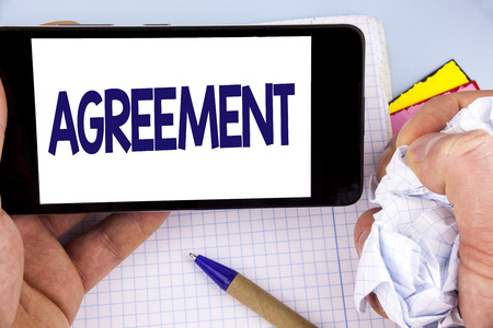 Handwriting text writing Agreement. Concept meaning Business or personal closures made easy with better guidance written Mobile Phone Screen holding by man plain background Notebook Pen