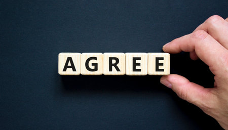 Agree symbol. Concept word Agree on beautiful wooden blocks. Beautiful black table black background. Businessman hand. Business agree concept. Copy space.