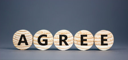 Agree symbol. Concept word Agree on beautiful wooden circles. Beautiful gray table gray background. Business agree concept. Copy space.
