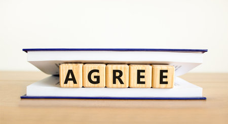 Agree symbol. Concept word Agree on beautiful wooden blocks in book. Beautiful wooden table white background. Business agree concept. Copy space.