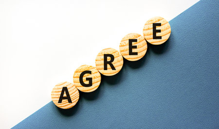 Agree symbol. Concept word Agree on beautiful wooden circles. Beautiful white and blue background. Business agree concept. Copy space.
