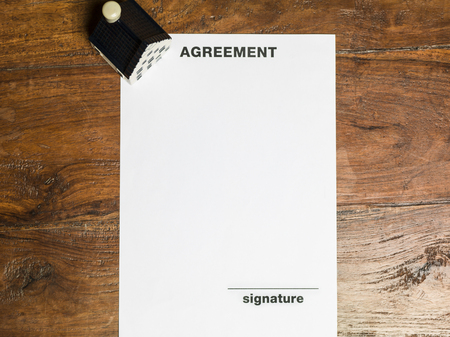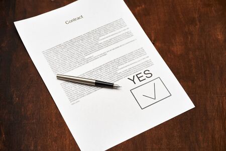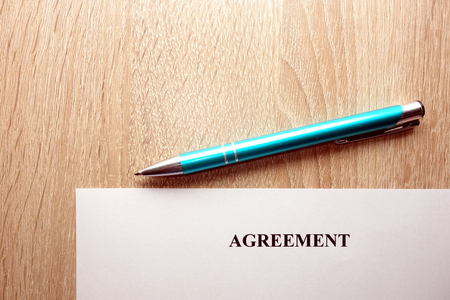 Blank agreement document and pen on desk in office, copy space for your text or object