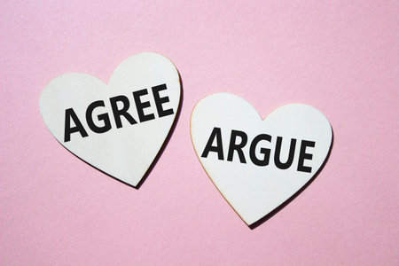 Agree or Argue symbol. Concept word Agree or Argue on wooden hearts. Beautiful pink background. Business and Agree or Argue concept. Copy space