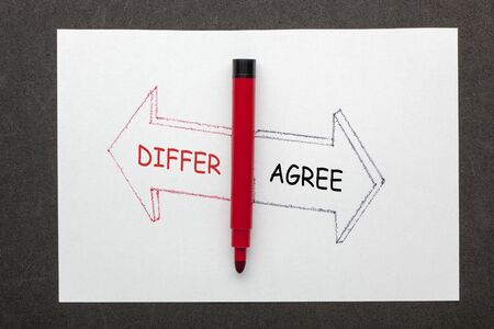 The words agree vs differ written in two arrows on a white background. Business concept.