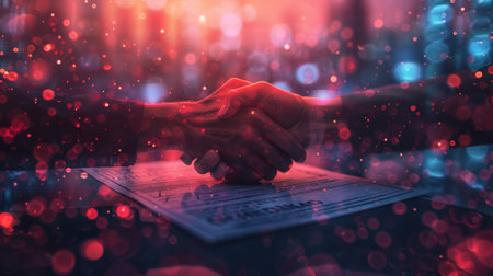 Two individuals are engaging in a handshake gesture while positioned over a document. The interaction signifies a formal agreement, negotiation, or partnership between the pair.