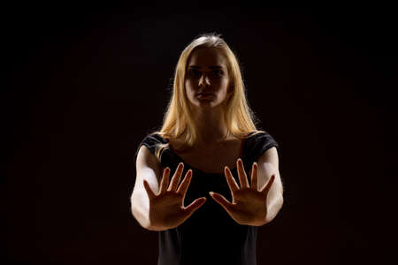 Young woman waving her hands. Blonde girl expressing with raised hands their emotions in a studio on a black background