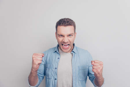 Portrait of young angry man shouting with rage, clenching fists on grey studio background. Furious Caucasian guy screaming with anger