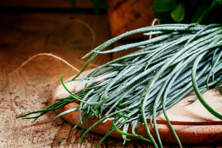Green onions with drops of dew on a vintage wooden background, selective focus