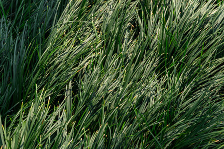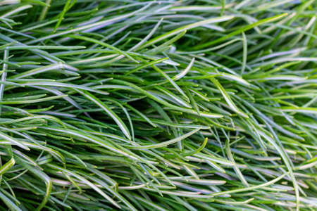 Closeup of lush uncut green grass with drops of dew in soft morning light