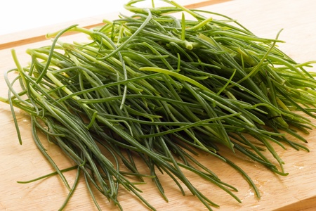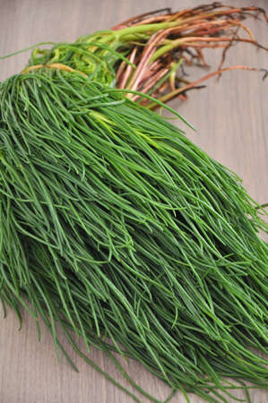Garlic chives or Allium tuberosum on wooden table background. Fresh healthy organic green vegetable.