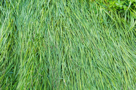 High dense lodged grass with long narrow leaves and green ears covered with water drops after a rain in spring overcast day, top view