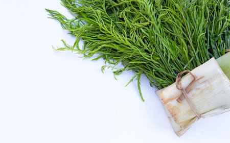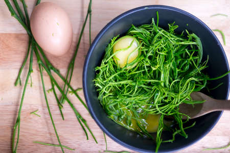 Egg and Acacia Pennata or Climbing Wattle ingredient for cooking, Thai cuisine. Calls that cha-om omelet