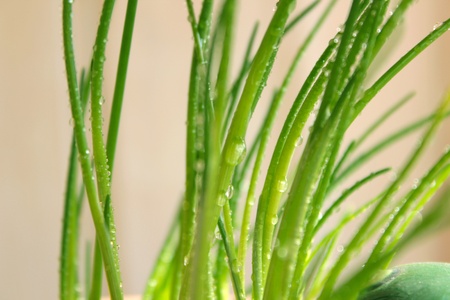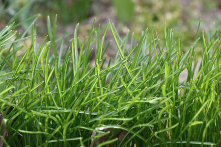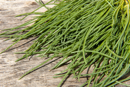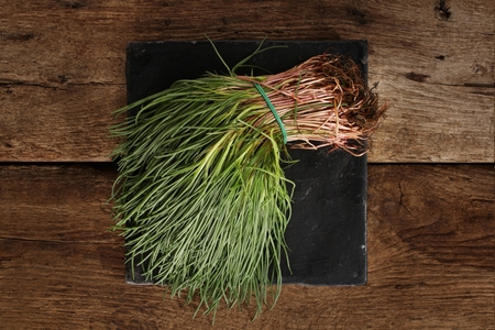 Fresh chives table top isolated on grey wood background grass slender leaves