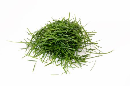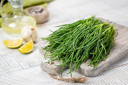 Fresh Agretti or barba dei frati, edible green plant. Saltwort, barilla plant or salsola soda. White table surface.