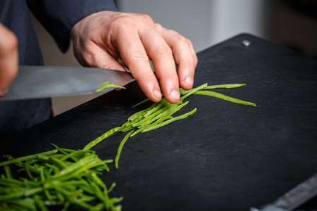 a young man cuts the edible part of some wild asparagus, on a stone surface next to a bunch of wild aspargus