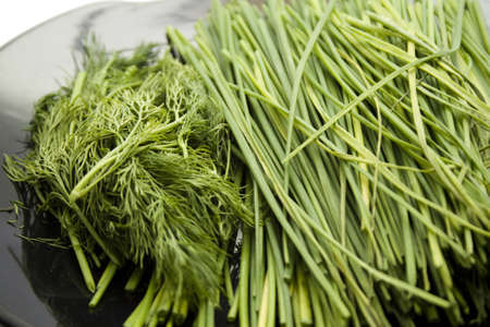 Fresh green onions and dill on a white plate, wooden background. Diet food concept. Flat lay. Copy space.