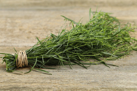 Bunch of fresh Salsola sodaon a striped napkin on wooden table. Italian Barba di frate or Agretti or Saltwort on wooden background