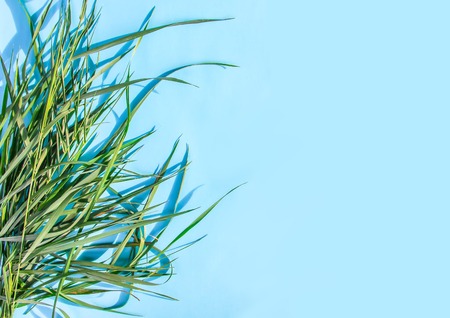 Green leaves on a soft blue background. Creative design with empty space for text.