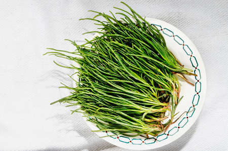 Bunch of agretti -salola soda or opposite -leaved saltwort -on white plate, fresh uncooked green leaves
