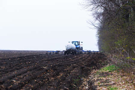 Farmer with tractor seeding - sowing crops at agricultural field. Plants, wheat.