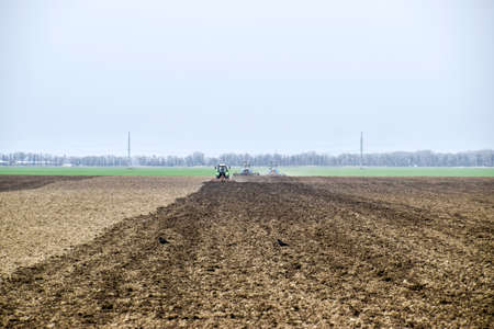 Lush and loosen the soil on the field before sowing. The tractor plows a field with a plow.