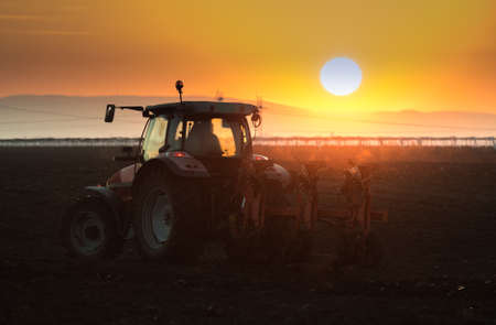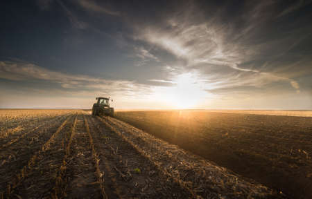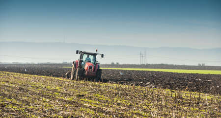 Tractor plowing fields. Preparing land for sowing in autumn.