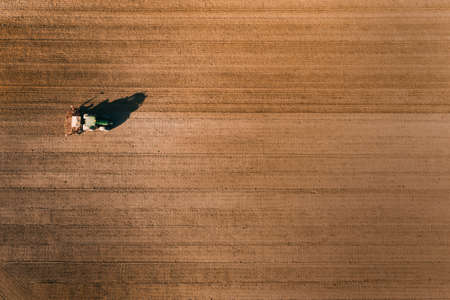 Above top view, of tractor as pulling mechanical seeder machine over arable field, soil, planting new cereal crop, corn, maize.