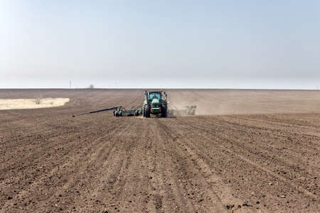 Kharkiv, Ukraine - April 10, 2019: Green tractor with trailed seeder working in field in a sunny spring day in Kharkiv Oblast, Ukraine on April 10, 2019