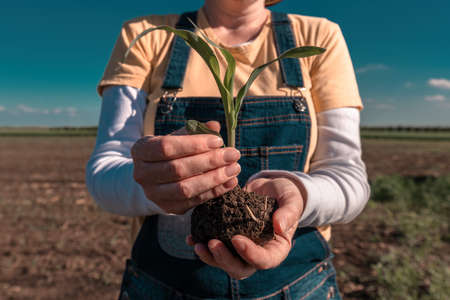 Corn crop sprout in female farmer's hands, close up with selective focus