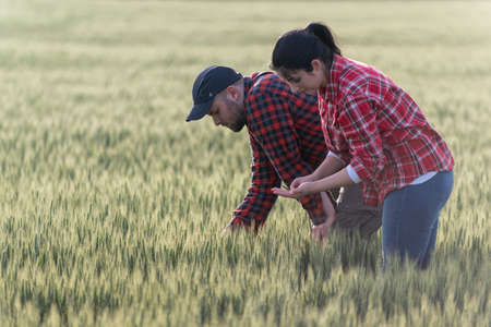Agronomist walking through green wheat field and examining plantation, adult male farmer controlling crop development