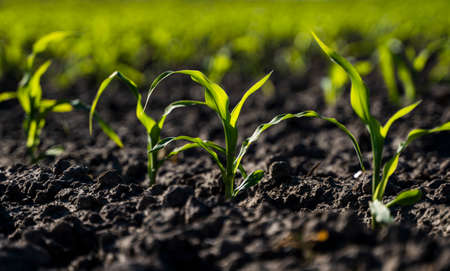 Growing young green corn seedling sprouts in cultivated agricultural farm field, shallow depth of field. Agricultural scene with corns sprouts in earth closeup.
