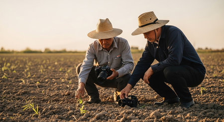 Two farmers wearing hats are inspecting young crops in a field during sunset, using a drone for aerial monitoring and analysis of plant health.