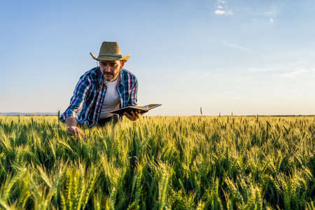 agriculture technology concept man Agronomist Using a Tablet in an Agriculture Field read a report