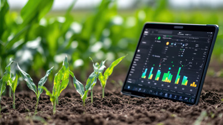 This image showcases precision agriculture with corn seedlings alongside a tablet displaying data analytics, highlighting the integration of technology in modern farming practices.