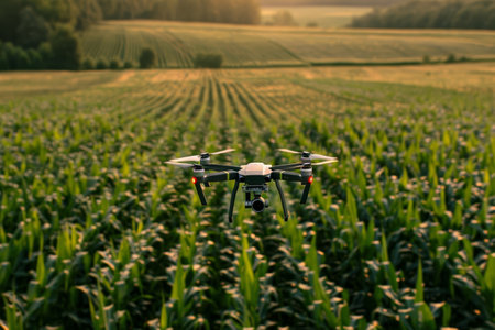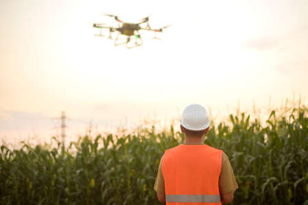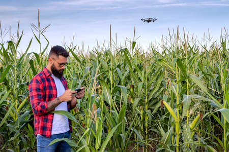 modern technological farmer analyzing the growth of corn by flying a drone over his cultivated fields. concept of sustainable exploitation of natural resources.