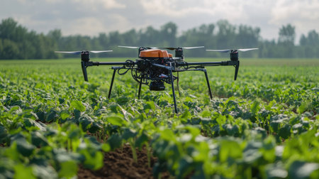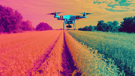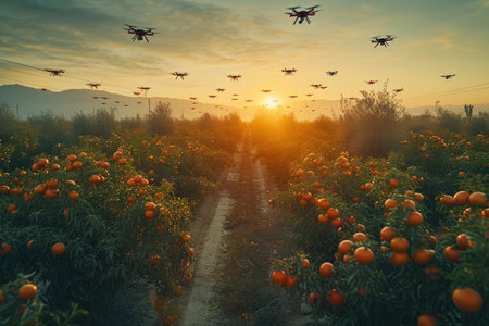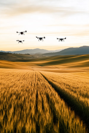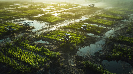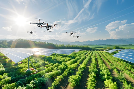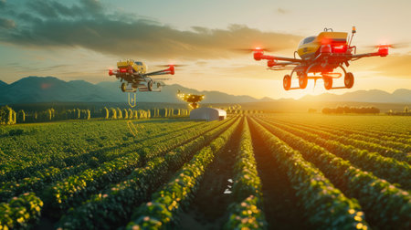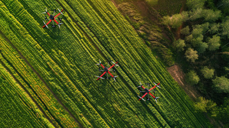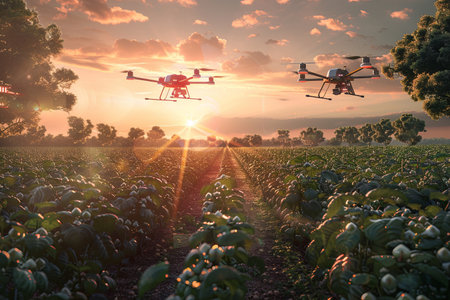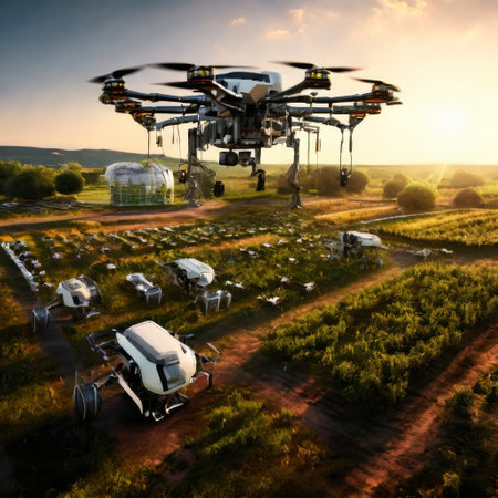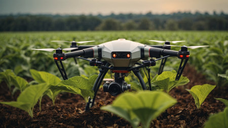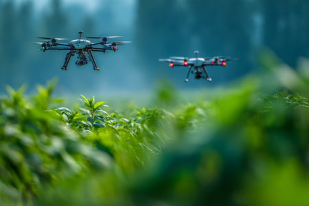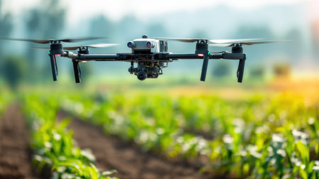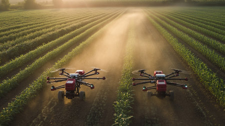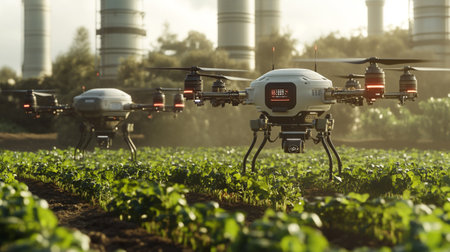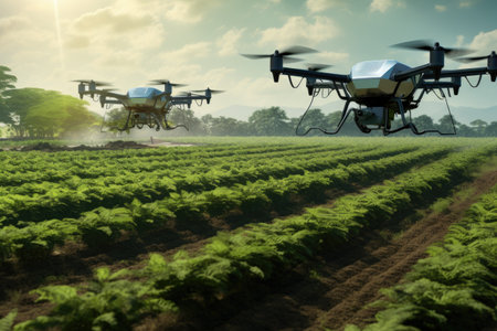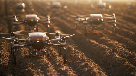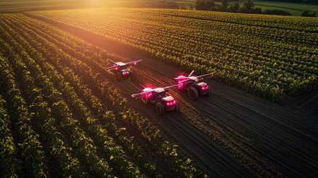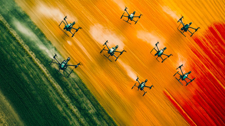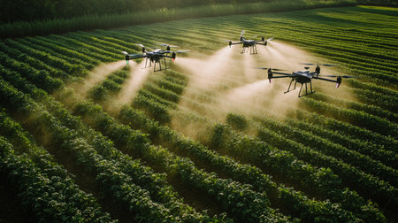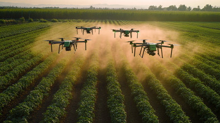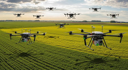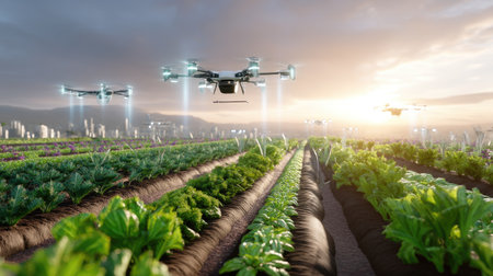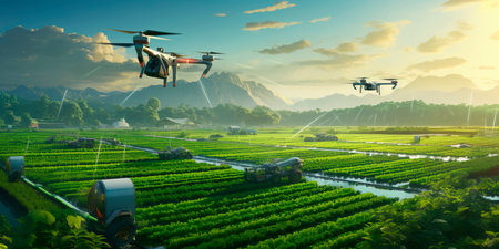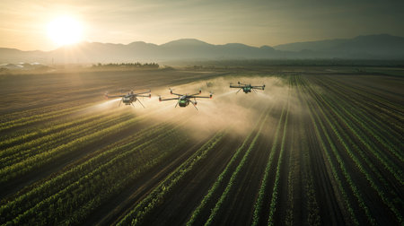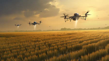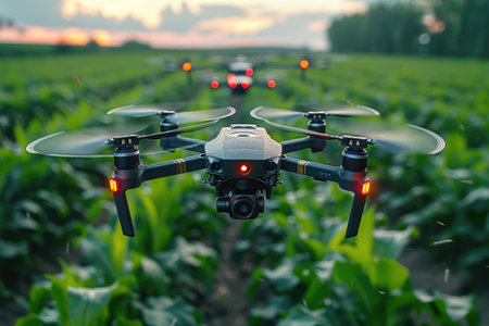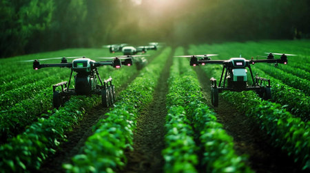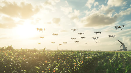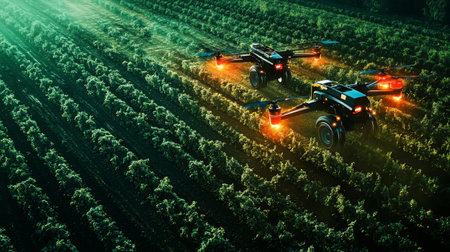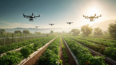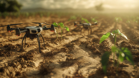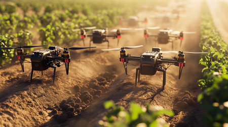 High-tech drones monitoring crops from above, highlighting the future of farming with precision techniques.