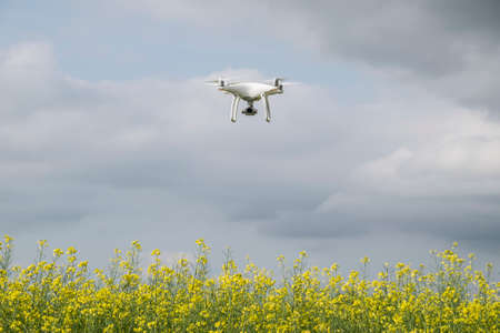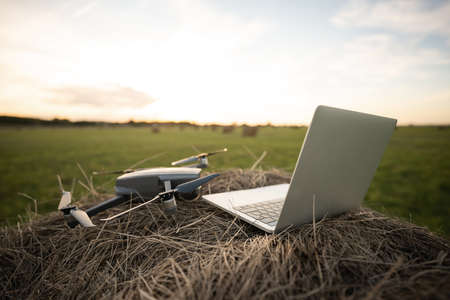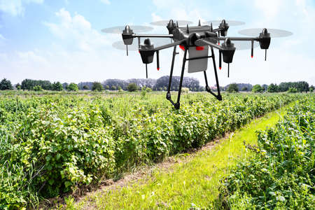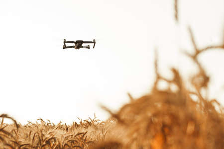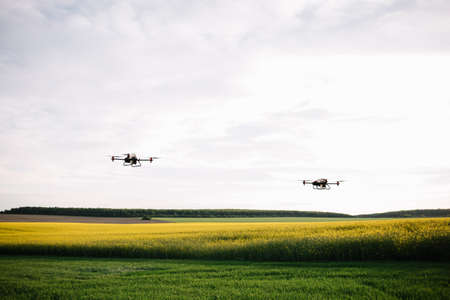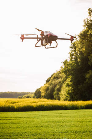 Agriculture drone flying over agricultural field. Drone flying in the air.