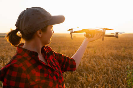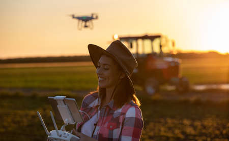 Woman agronomist using drone modern technology in agriculture. Young farmer standing in field at sunset in front of tractor machinery.