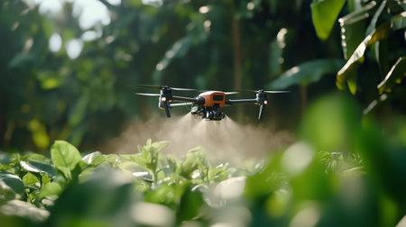 An agricultural drone sprays fertilizer on the fields. Generative AI