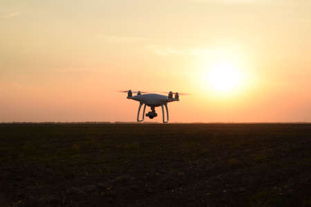 Quadrocopters silhouette against the background of the sunset. Flying drones in the evening sky.