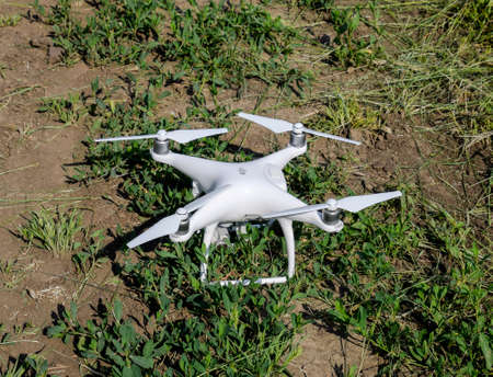 Krasnodar, Russia - May 30, 2017: White drone on the soil with grass