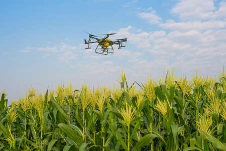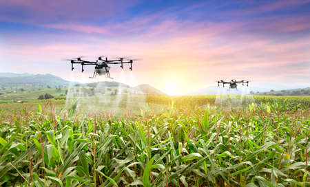 Smart farming Agriculture drone fly to spray on corn fields, Farmers spray insecticides with agricultural drones