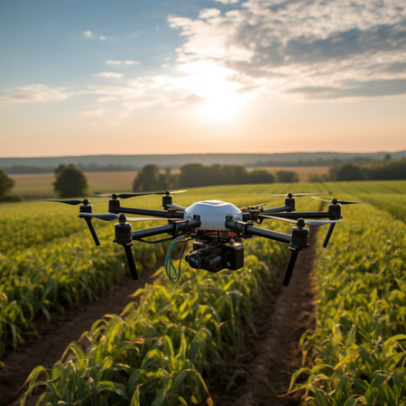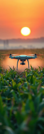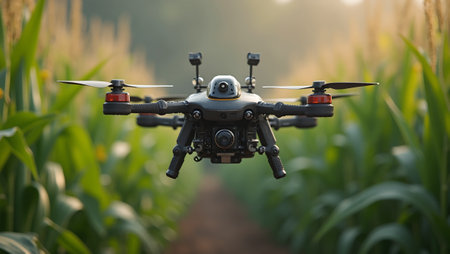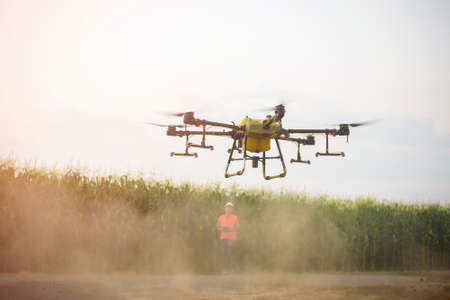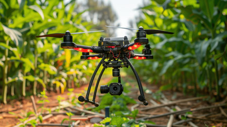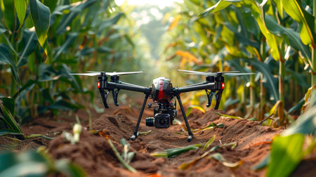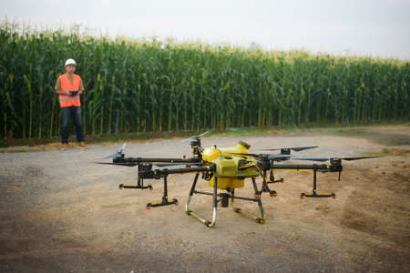 An agriculture drone takes flight to spray fertilizer on the sweet corn fields, optimizing crop growth.