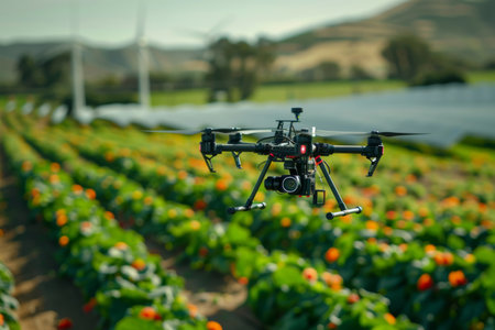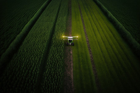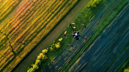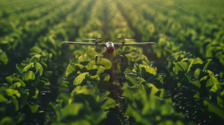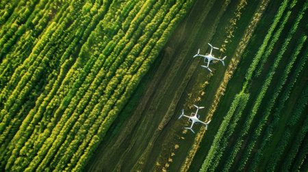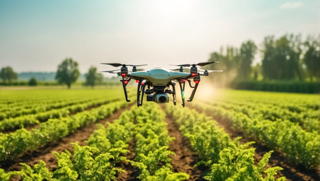 A quadcopter drone flies over vibrant green crop rows, its advanced technology aiding in precision farming and sustainable agriculture. The symmetry of the fields contrasts with the drone's sleek